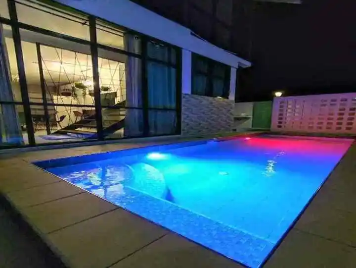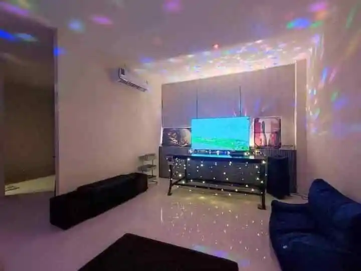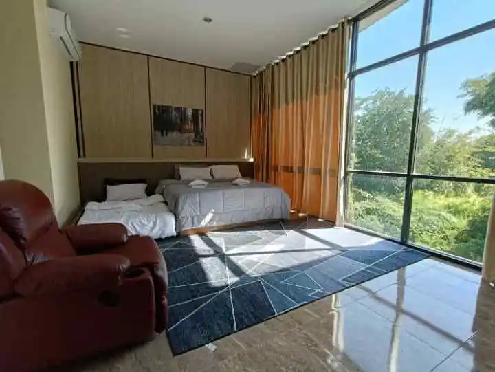 The villa offers 5 spacious bedrooms, each featuring a 6-foot bed and a 3.5-foot single bed, all en-suite with fresh towels. A powder room is also available for guests. The entertainment room features a 70-inch smart TV and a complete karaoke audio system, making it a perfect space for family fun.