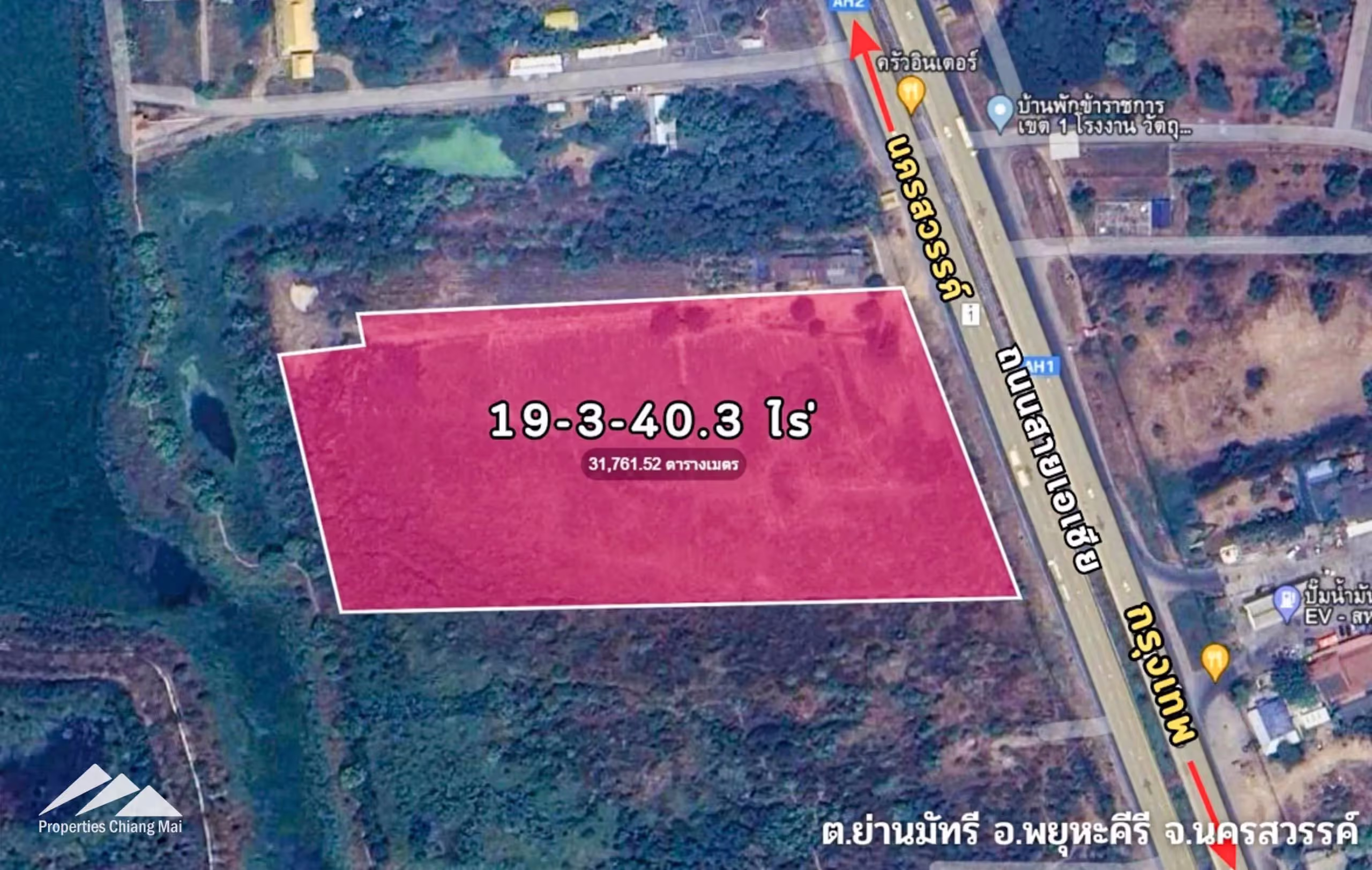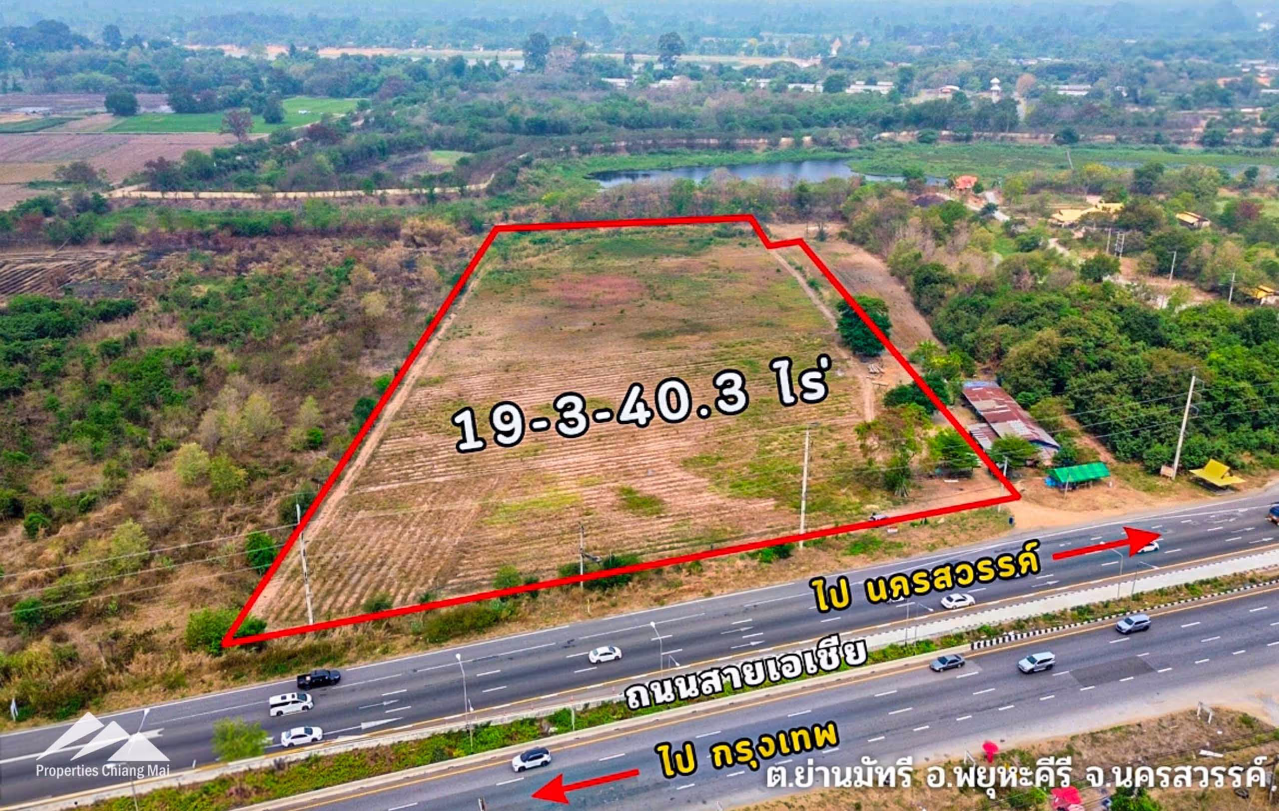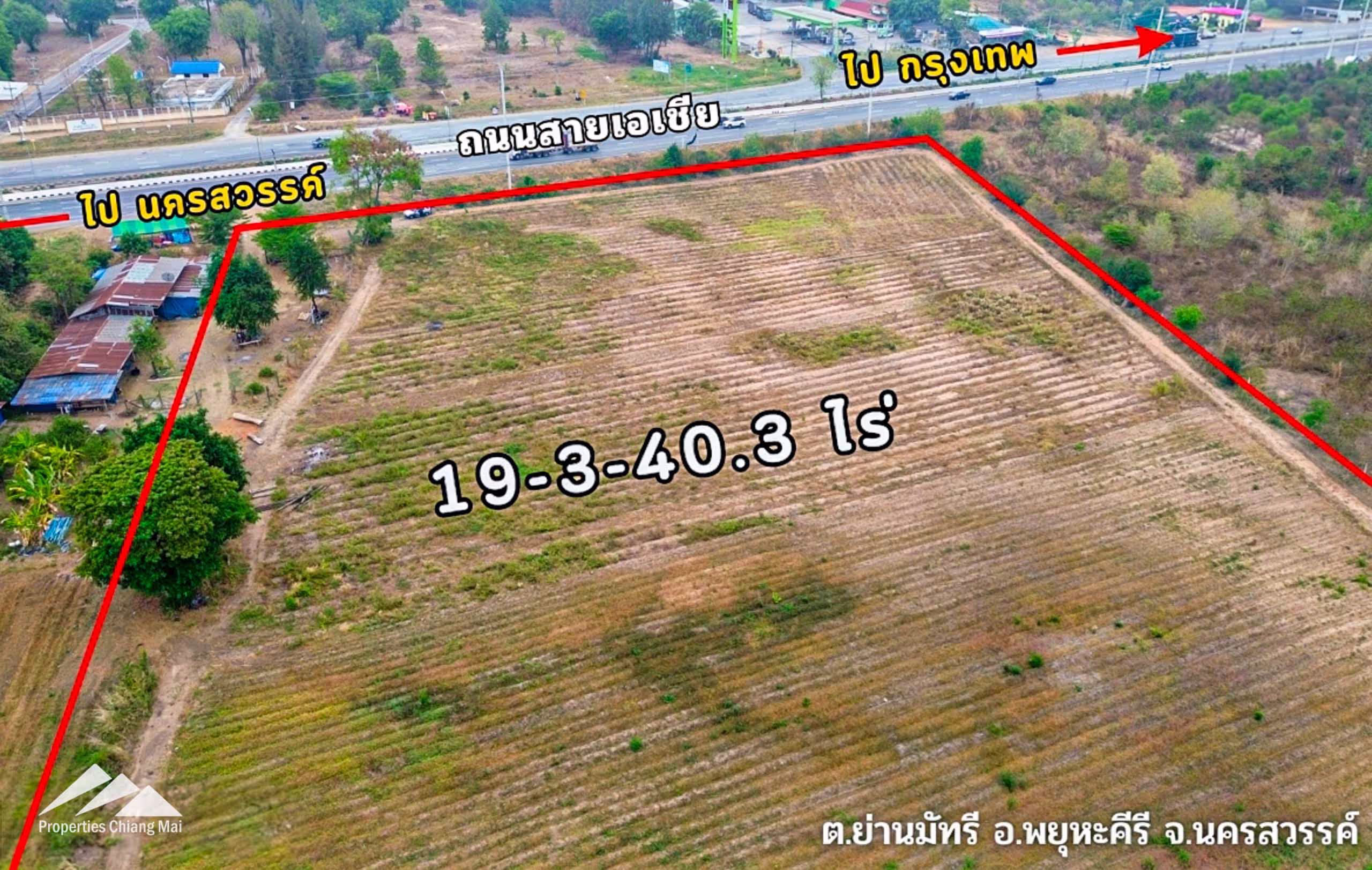 Land for sale next to Asia Road (Northbound) in Phayuha Khiri District, Nakhon Sawan Province. Pricing breakdown and transfer fees:14,975 THB/Sq. wah (5,990,000 THB/Rai). (Discounted from 17,000 THB/Sq. wah - 7,000,000 THB/Rai) transfer fees 50:50