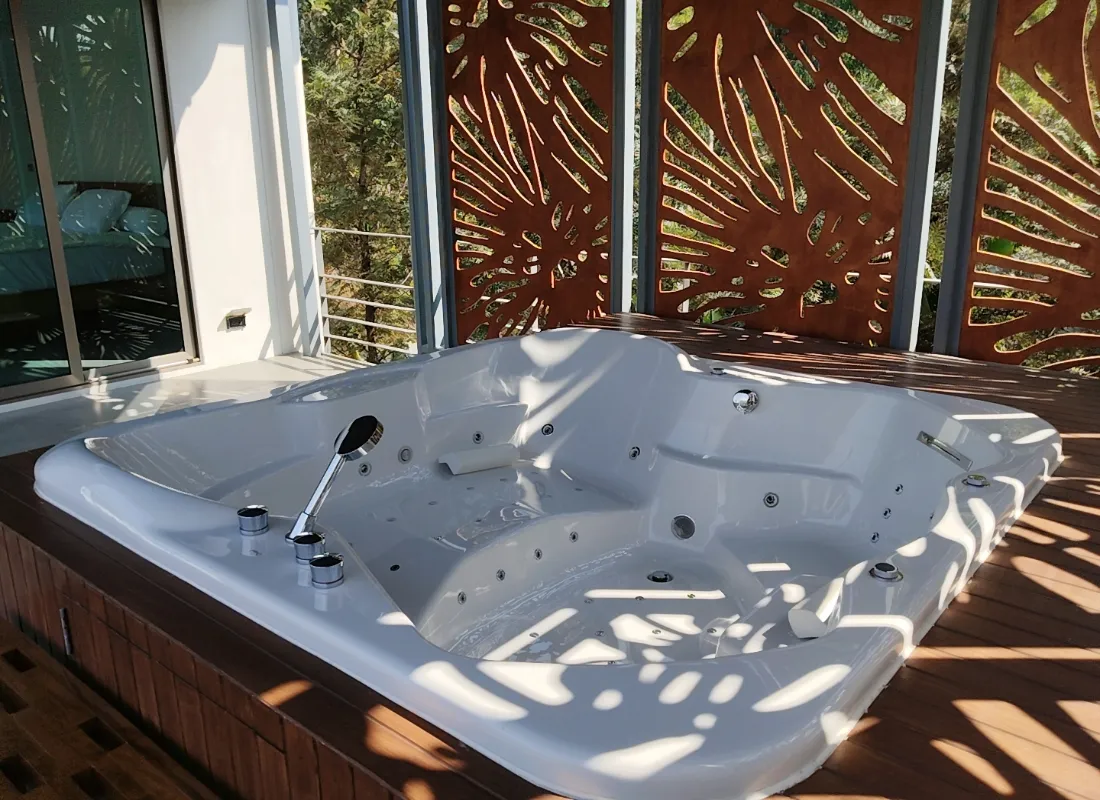 Set in a serene location, this villa features stunning views of the mountains and tranquil surroundings. The outdoor lounge and dining areas create an ideal space for entertaining guests while enjoying the beauty of nature. Additionally, the auto roof system for the outdoor bar counter and jacuzzi adds a unique touch to this already exceptional property.