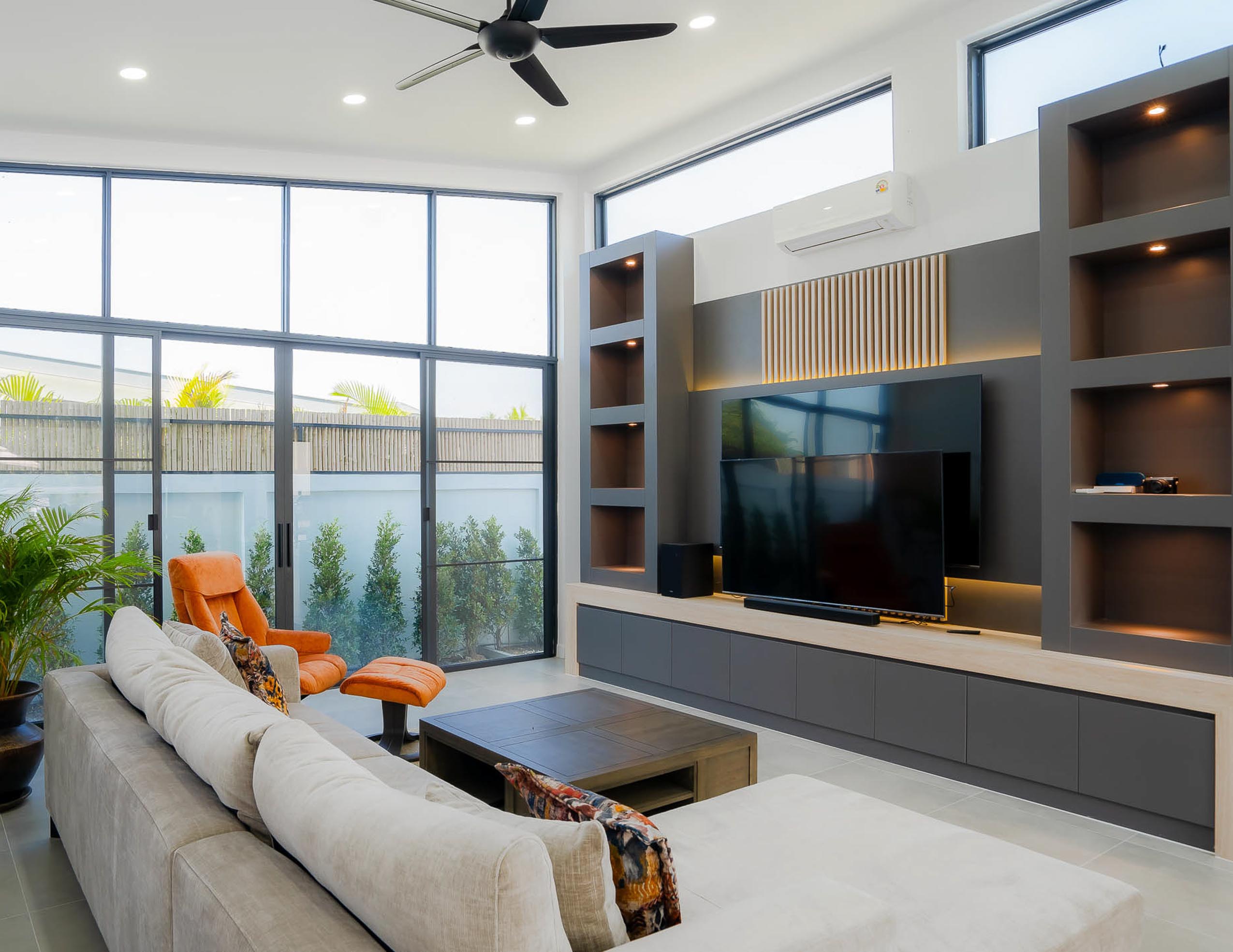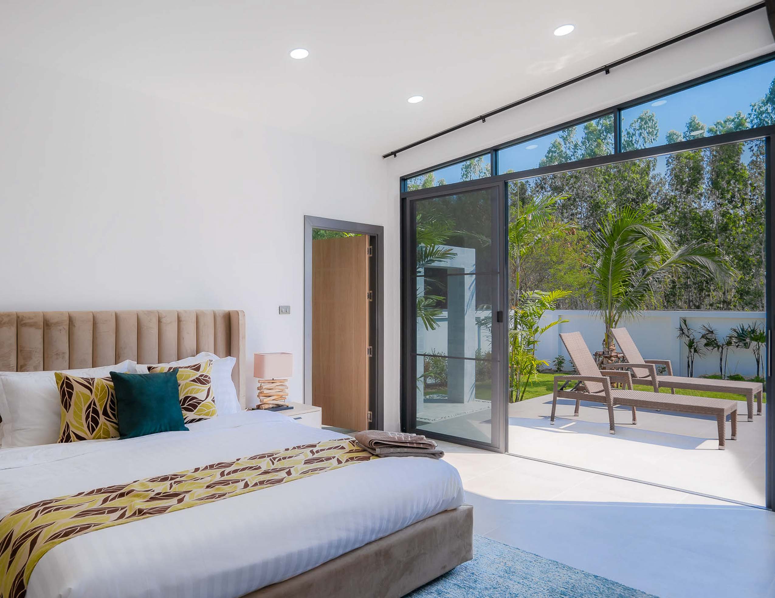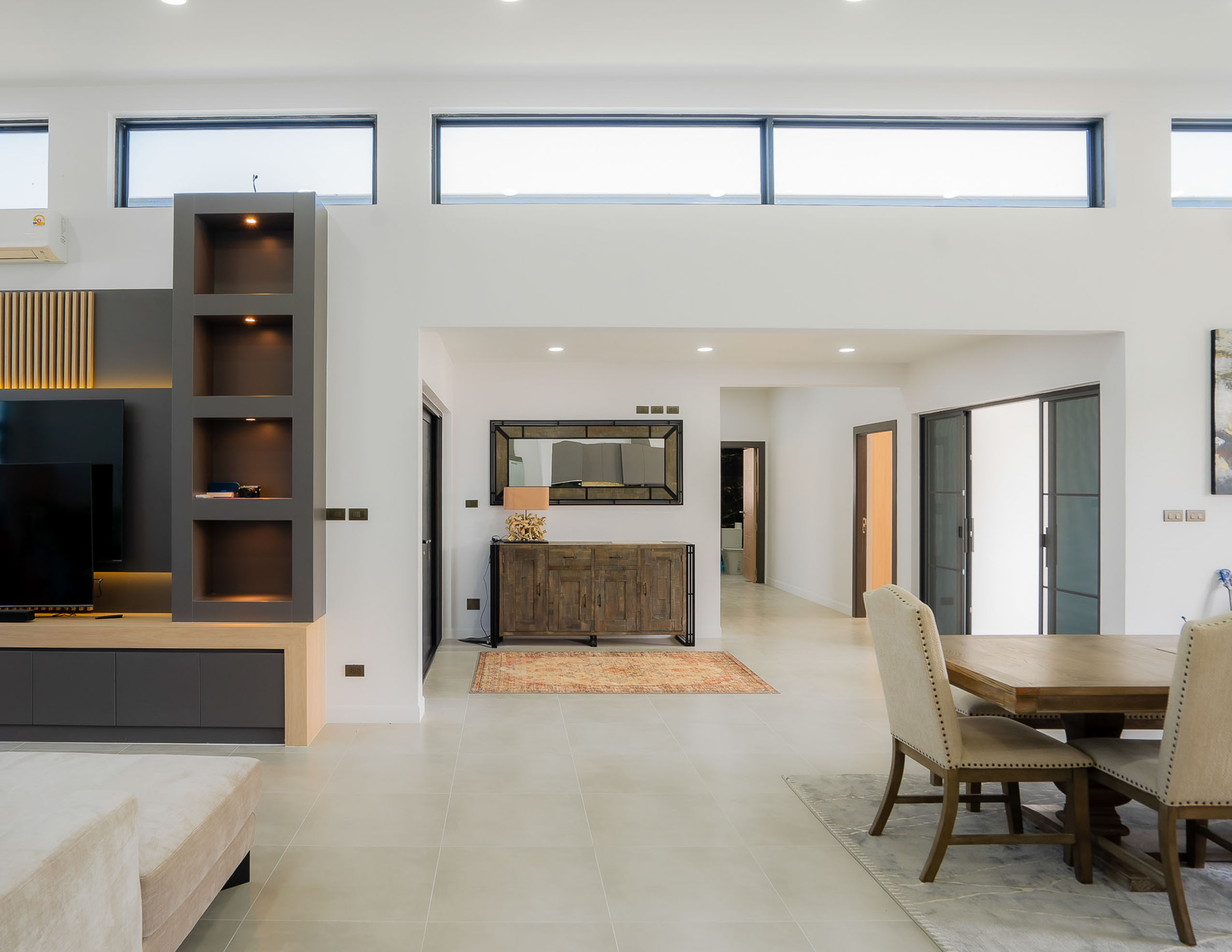 A beautifully designed modern pool villa offering spacious living with an emphasis on natural light, privacy, and smart layout. The home features high feature ceilings and floor-to-ceiling glass that draws the outdoors in, creating a bright and uplifting atmosphere. The open kitchen with a breakfast bar looks out across a sleek 15-meter pool, while large patio doors allow seamless access to the garden.