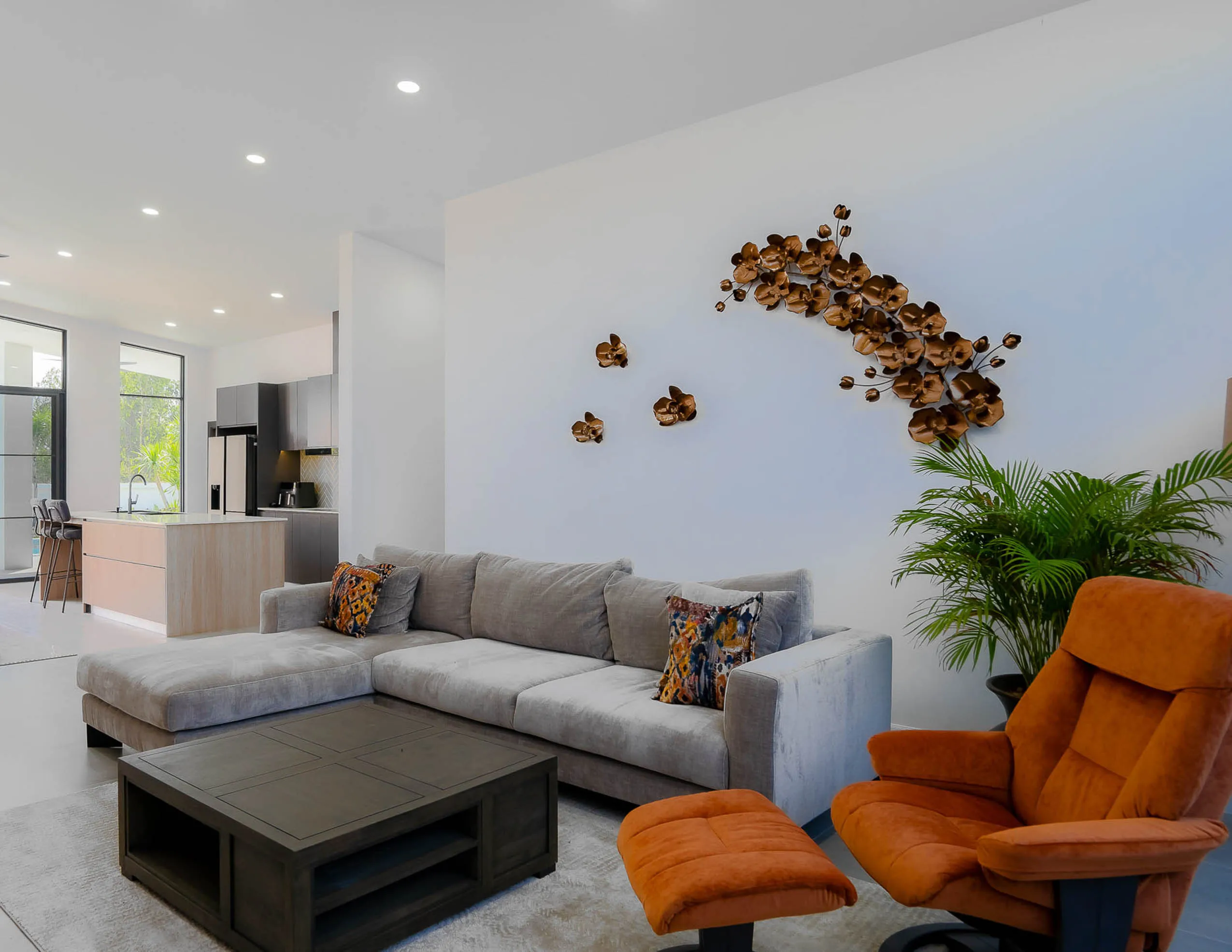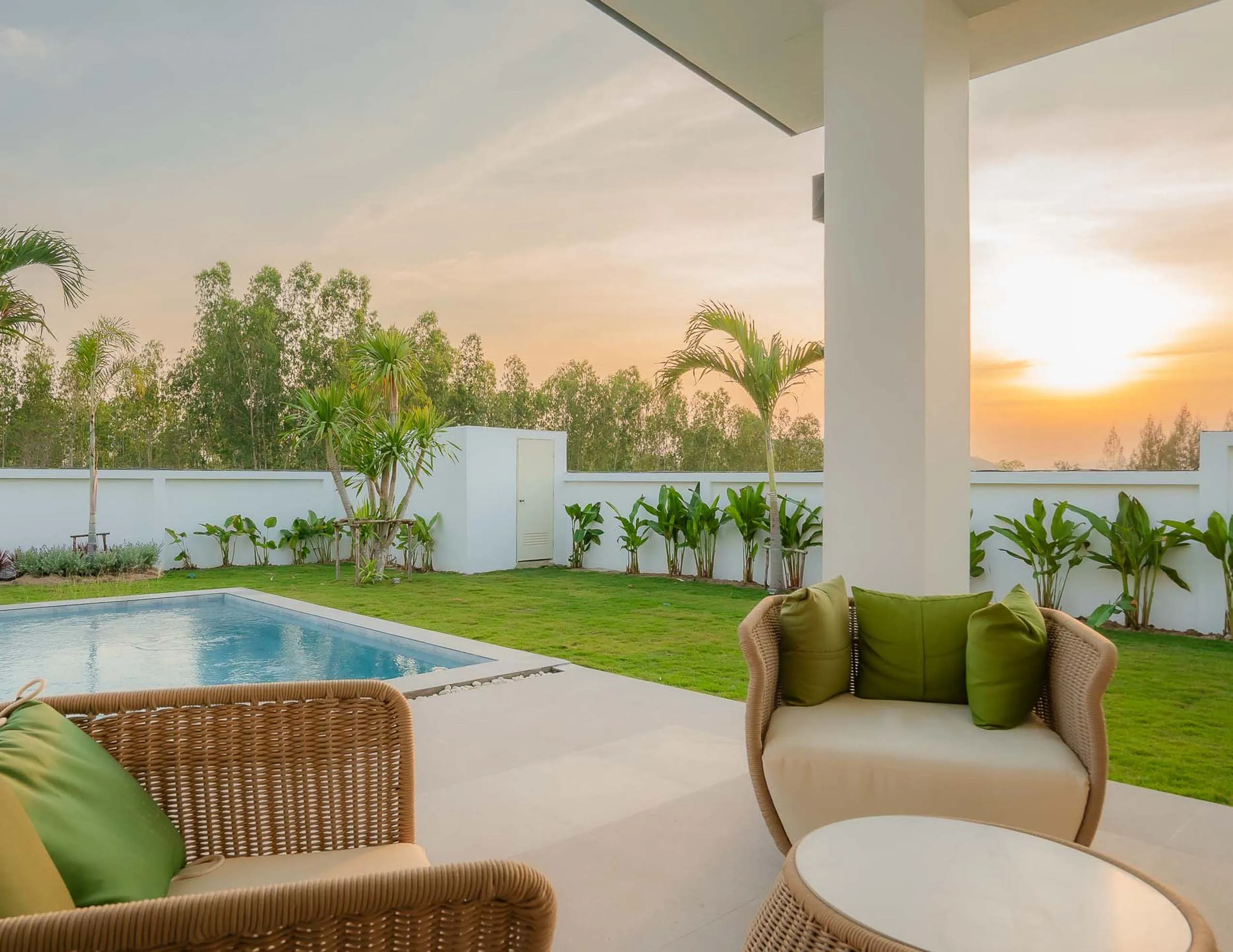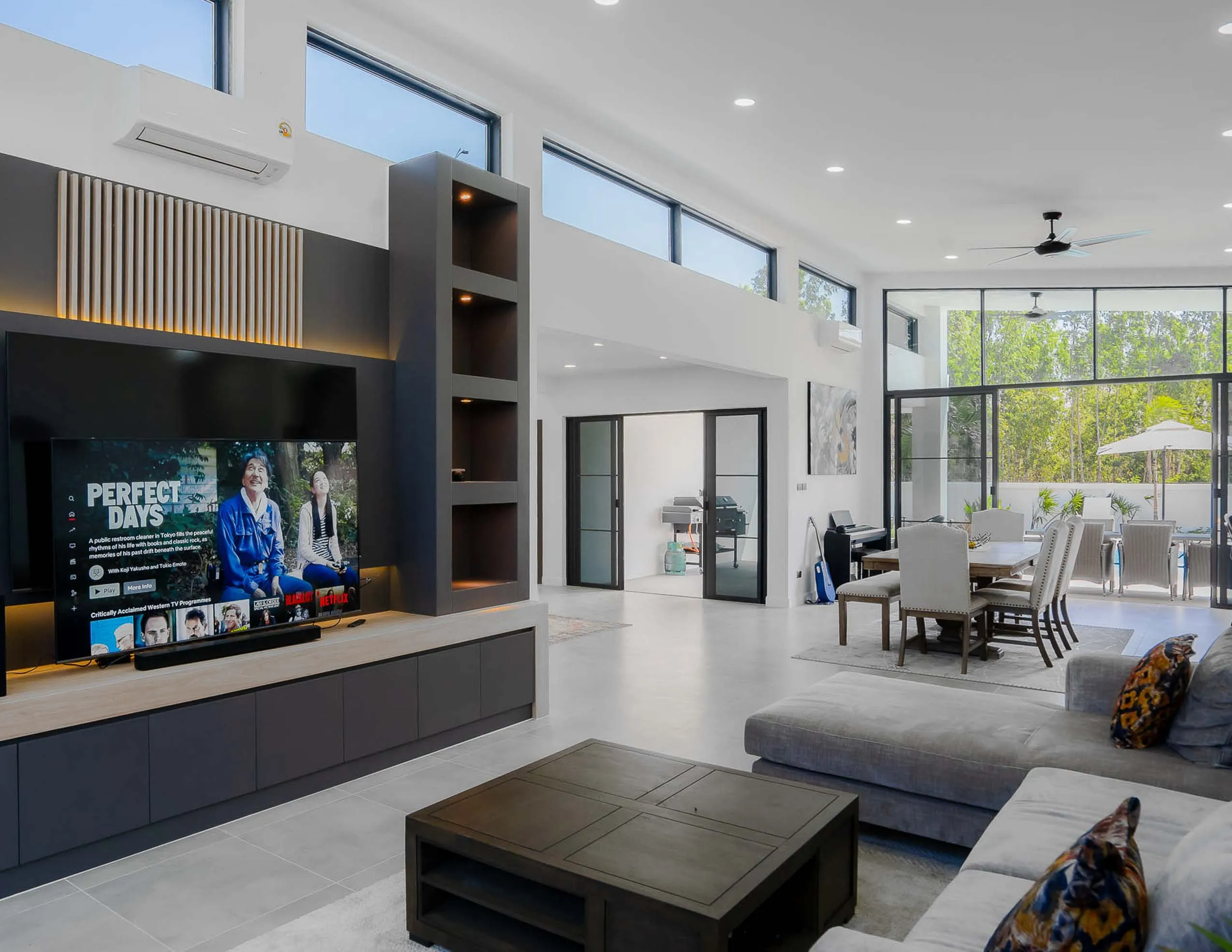 A beautifully designed modern pool villa offering spacious living with an emphasis on natural light, privacy, and smart layout. The home features high feature ceilings and floor-to-ceiling glass that draws the outdoors in, creating a bright and uplifting atmosphere. The open kitchen with a breakfast bar looks out across a sleek 15-meter pool, while large patio doors allow seamless access to the garden.
