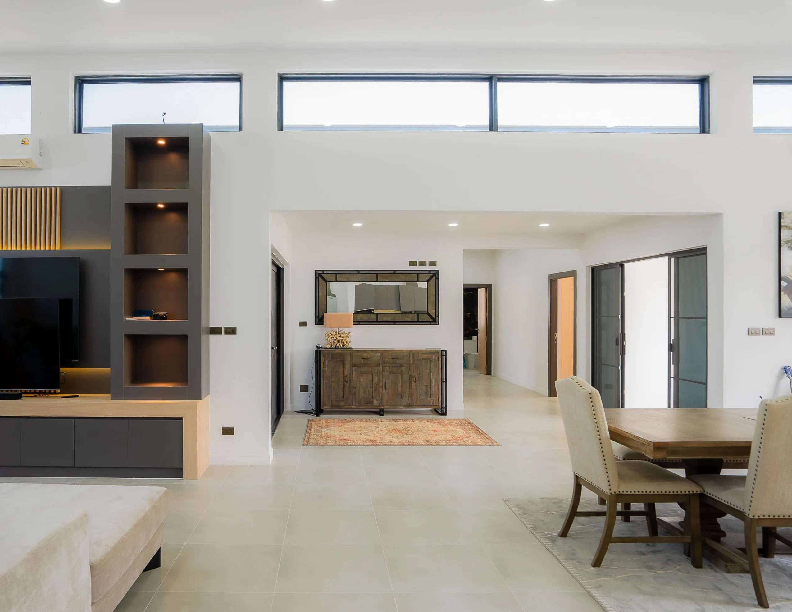 - Open-plan layout with lounge and dining areas positioned for flow and function