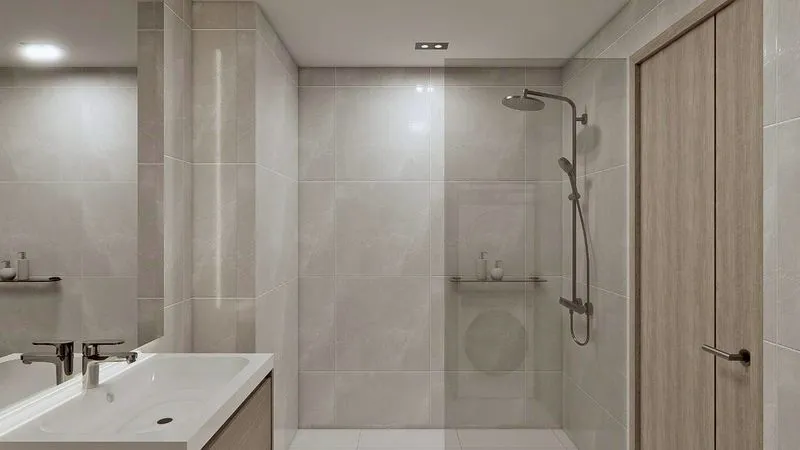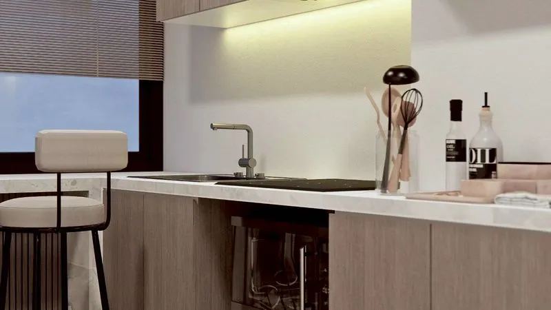- The Kitchenette: This sleek, functional space features a modern electric stove and hood, a full-sized two-door refrigerator, and a microwave. As a special bonus, a dedicated drinking water filter is already installed for your convenience.