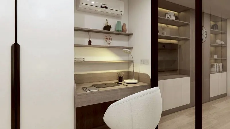- The Main Living Space: The room is anchored by stunning, custom built-in furniture that maximizes space and style. Morning light fills the area, highlighting the warm design tones. In the evening, it becomes your personal cinema with a 55" Android TV. And always, there is that beautiful mountain view, a calming natural backdrop to your city life.