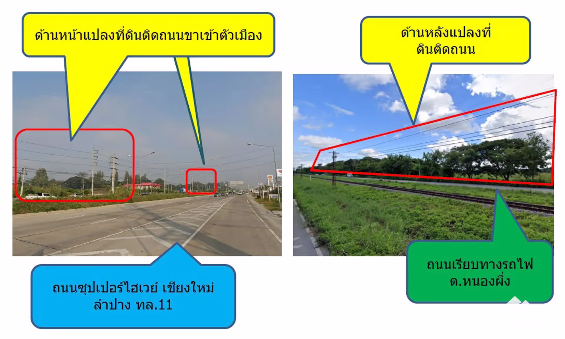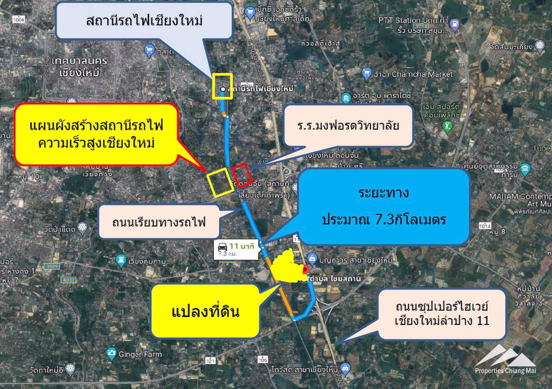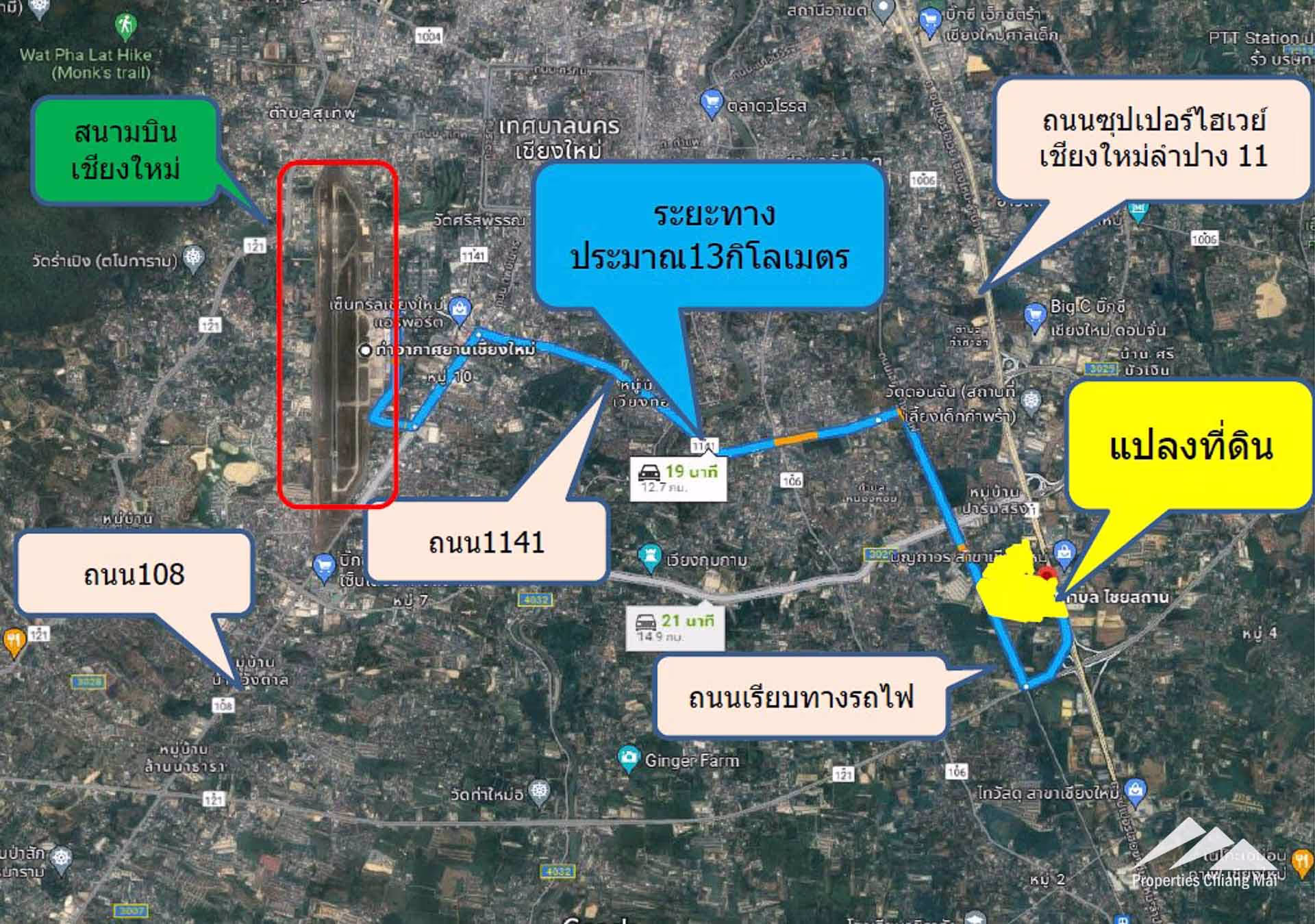 Conveniently located in between Hwy 121 & 3029, with two entrances on the Superhighway 11 (Chiang Mai-Lampang), and a rear entrance on the Railway Road, this large 235+ Rai (235-2-56.4) block of land in Saraphi is an excellent location for various types of development projects and only 1o km/10min from the Airport.