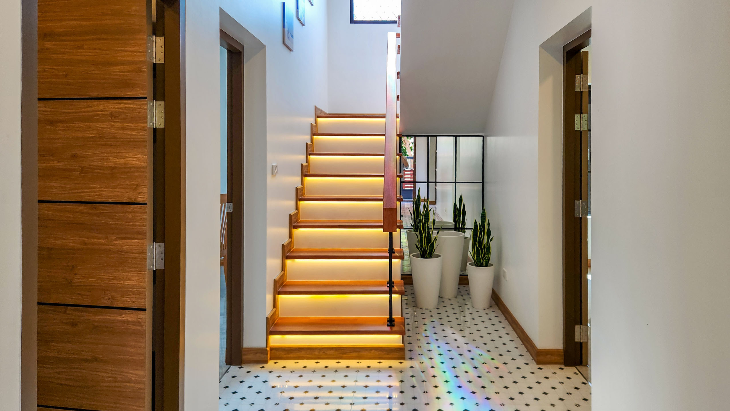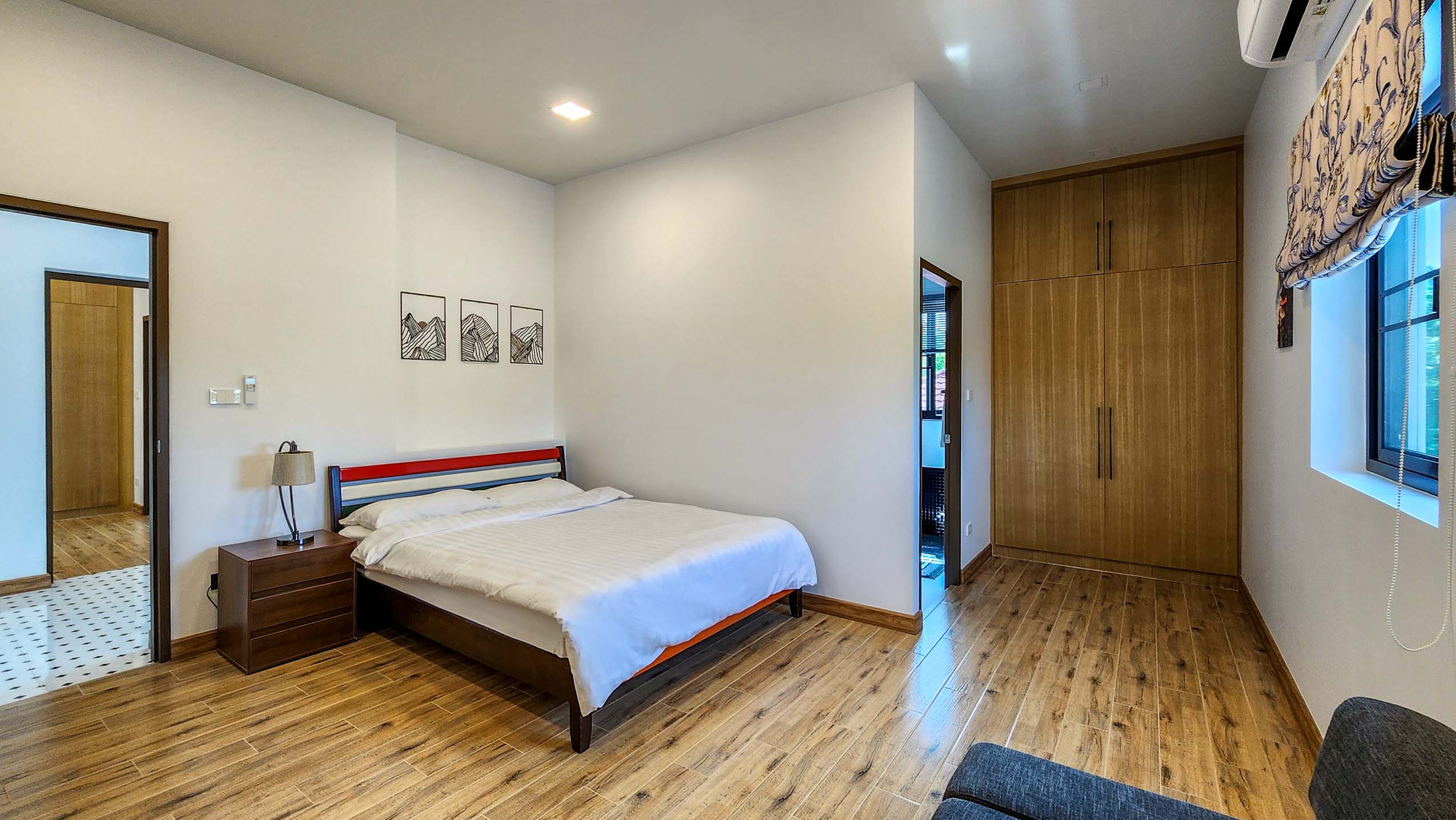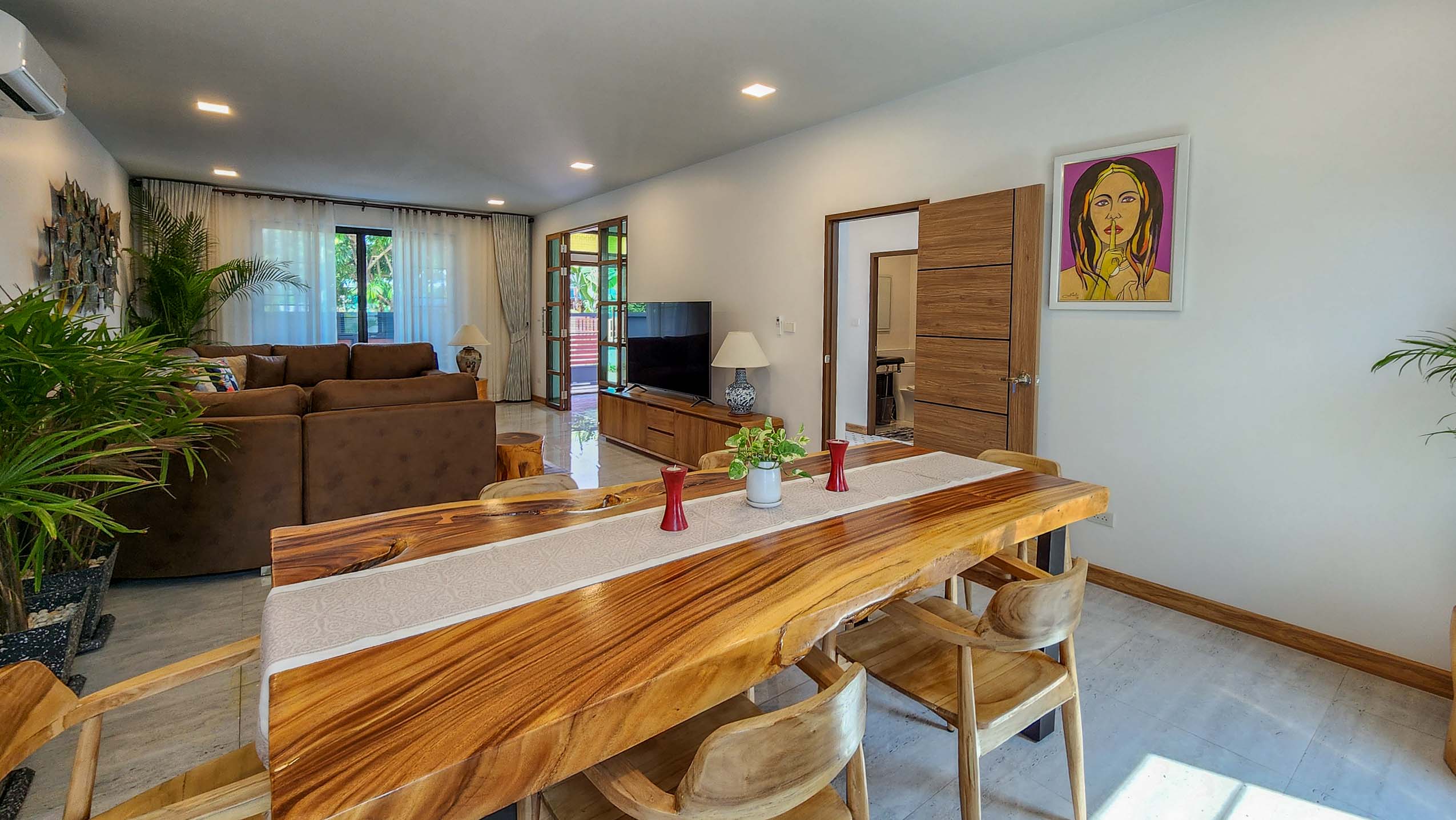 Inside, the living and dining area greets you with natural textures, stylish decor, and rich wooden furnishings that radiate a warm, organic feel. The bespoke western kitchen, separated by elegant sliding glass doors, features clean lines, handcrafted cabinetry, and a striking marble tile backsplash offering both aesthetics and performance for the home chef.