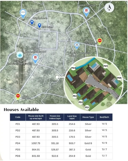 - การเดินทางและการขนส่ง: เพียง 10 นาทีถึง สนามบินนานาชาติเชียงใหม่.ที่สำคัญคือบ้านอยู่ในตำแหน่งขนานกับรันเวย์ ทำให้คุณสะดวกในการเข้าถึงโดยไม่มีเสียงรบกวนเส้นทางเที่ยวบินเหนือศีรษะโดยตรง