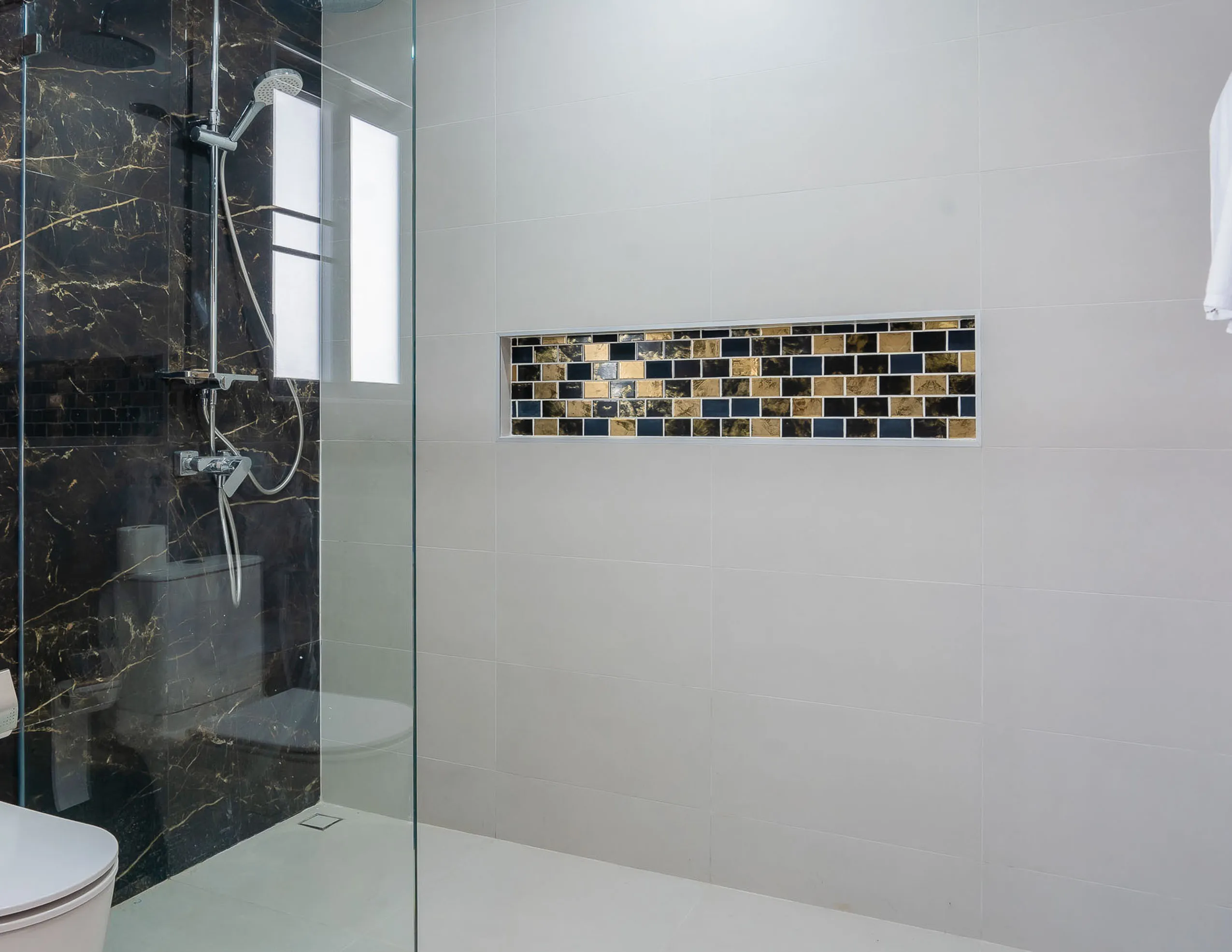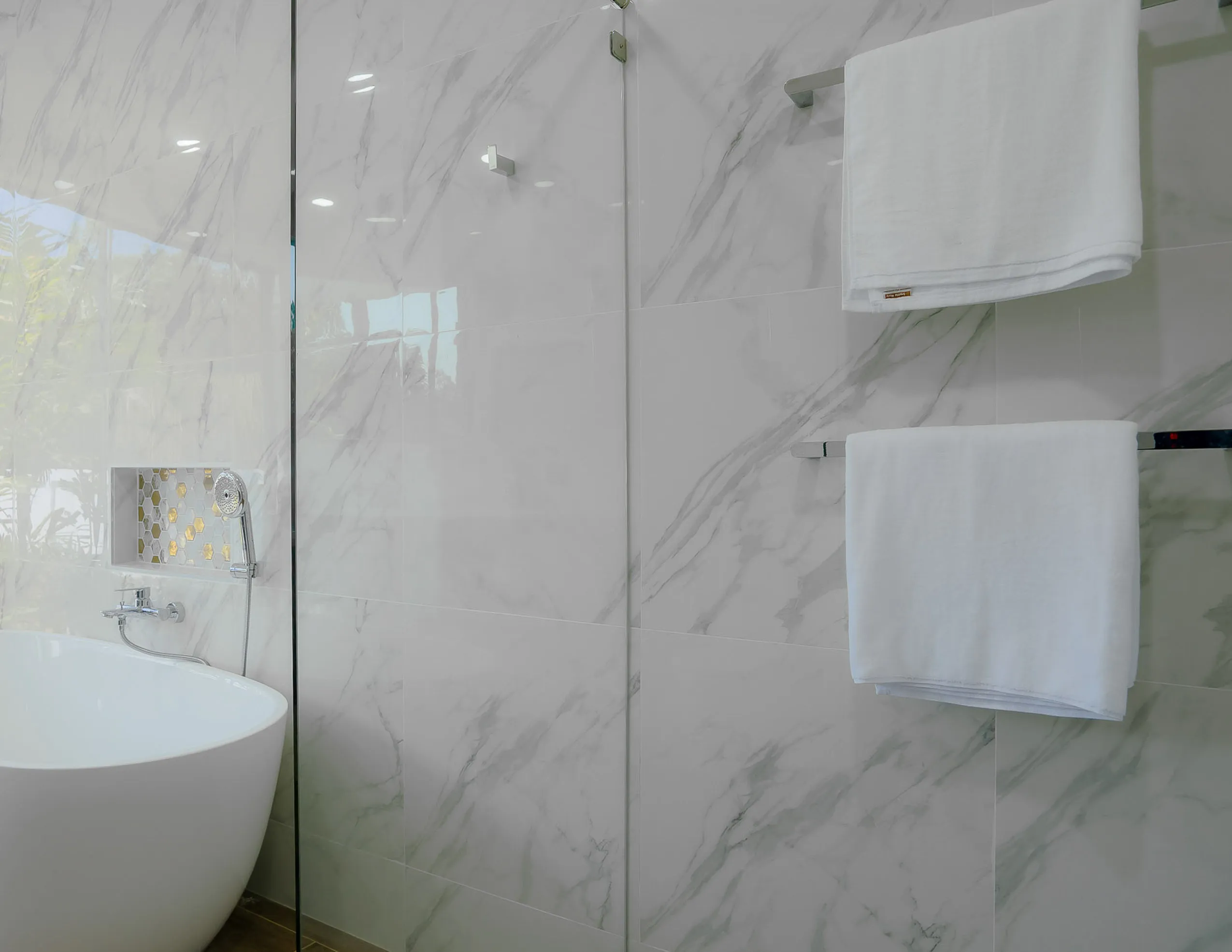 - ห้องสวีทหลักพร้อมห้องน้ำในตัว ตู้เสื้อผ้าแบบวอล์กอิน และหน้าต่างแกลเลอรี่หันหน้าไปทางสระว่ายน้ำ