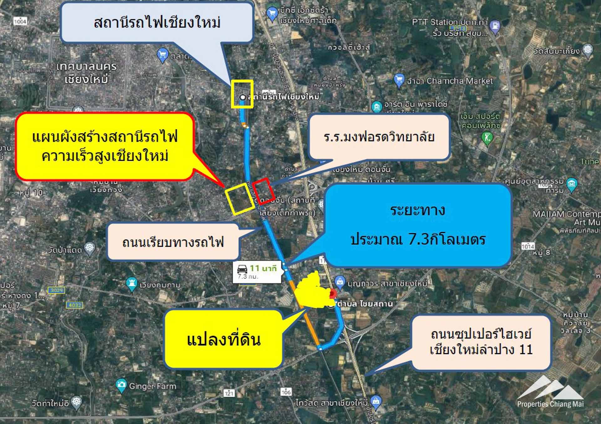 ตั้งสะดวกระหว่างทางหลวงหมายเลข 121 และ 3029 มีทางเข้าสองทางเข้าบนทางหลวงหมายเลข 11 (เชียงใหม่-ลำปาง) และทางเข้าด้านหลังบนถนนรถไฟ พื้นที่ขนาดใหญ่ 235+ ไร่ (235-2-56.4) ในจังหวัดสารภี เป็นสถานที่ที่ยอดเยี่ยมสำหรับโครงการพัฒนาประเภทต่างๆ และห่างจากสนามบินเพียง 1 กิโลเมตร/10 นาที