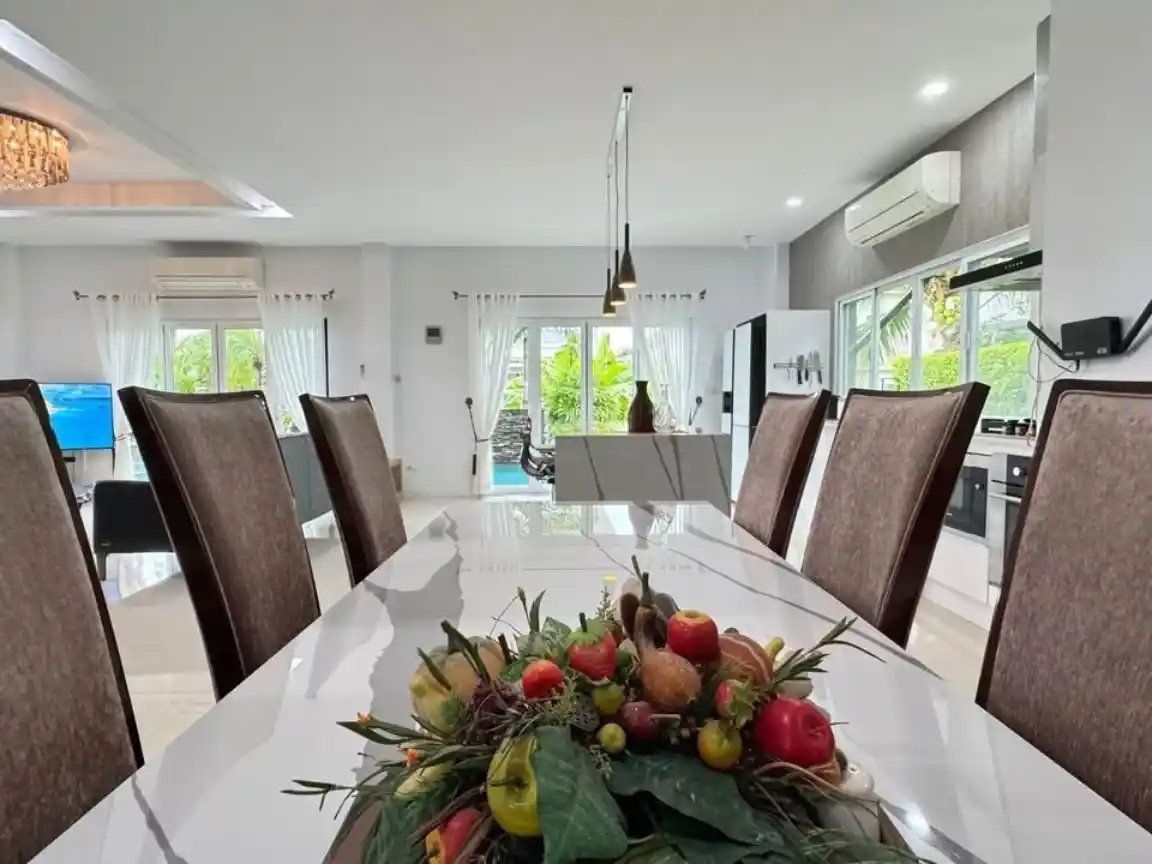 - พื้นที่อยู่อาศัยหลัก: พื้นที่นั่งเล่นและรับประทานอาหารขนาดใหญ่เปิดโล่งเป็นจุดที่สมบูรณ์แบบสำหรับครอบครัวที่จะมารวมตัวกันมันสว่างสบาย สบาย ๆ และมองออกไปสู่สระว่ายน้ำและสวน คุณจึงสามารถจับตาดูเด็ก ๆ ได้เสมอ